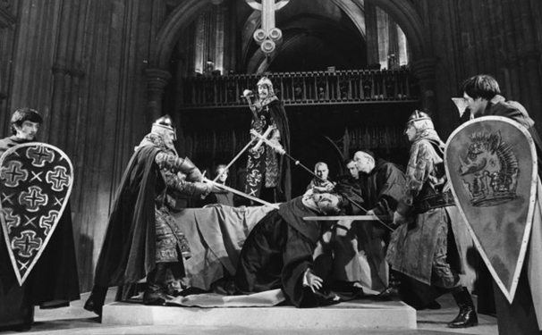 Четвертий спокусник – дивна камео самого Еліота за кадром – дарує Бекету славу самопожертви. Він лохун для цього, усвідомлюючи, що святість не за горами, хоча це «найбільша зрада / Зробити правильний вчинок з неправильної причини». Убиті чотирма солдатами за наказом короля, у підривному повороті наприкінці фільму вбивці звертаються прямо до камери, запитуючи глядачів, хто насправді повинен взяти на себе 800 років провини за смерть Бекета. Еліот завжди був благочестивим релігійним типом (він називав себе «католицьким складом розуму, кальвіністським спадком і пуританським темпераментом»), і все ж цікаво, що релігійні сцени тут мають відчуття моральних криз Берґмана — відомого атеїста. Сцена, в якій Бекет грає в шахи з одним зі своїх спокусників, може бути посиланням на 1957 рік. Сьома печатка якщо Вбивство в соборі не було зроблено цілих шість років тому. Відомий угорський композитор Ласло Лайта пропонує яскраві, хоч і шизофренічні музичні інтермедії, які додають щось цілком європейське в обстановку.
