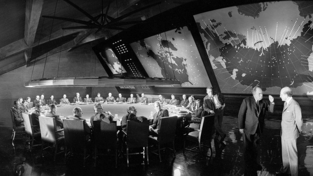 Що може піти не так? Відповідь полягає у блискуче божевільному бригадному бригадному Джеку Д. Ріппера (Стерлінг Хейден), який, його розум, доповнив теорії змови росіян (і жінок), крадучи його дорогоцінні тілесні рідини, вирішила в односторонньому порядку розпочати Другої світової війни, посилаючи накази про напад на Росію. Пітер Селлерс, безсумнівно, є зіркою шоу, по -різному грає президента США Меркіна — «Панове, ви не можете битися тут, це кімната війни!» -Капітан відчайдушної та співчутливої групи Ліонель Мандрейк і сам доктор Странгелове, прохолодний і зібраний перед Армагеддоном, окрім однієї рукавички, нацистської руки.