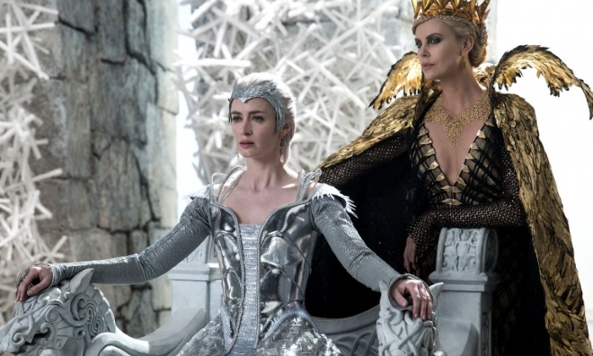 Шарліз Терон повторює свою роль відьми-вбивці короля Равенни, цього разу до неї приєднується її молодша сестра Фрейя (Емілі Блант), спочатку тендітна істота, яка після смерті своєї новонародженої дитини перетворюється на вбиту горем крижану королеву. Терон все ще тримається своєї рішучості зіграти роль якомога чіткіше. Тим часом Блант чудово грає морозну Фрейю. Поглинена горем, вона вважає, що всіх потрібно позбавити від болю кохання («Любов — це гріх»), тому вирішує викрасти дітей і навчити їх як своїх елітних воїнів, яких називають «Мисливцями». Якщо «Равенна» Терона натхненна — принаймні частково — «Малефісентою» Діснея, то Блант — це поєднання Заморожені Джадіс Ельзи та Тільди Свінтон з Лев, відьма і шафастворюючи одного з більш нюансованих персонажів фільму.